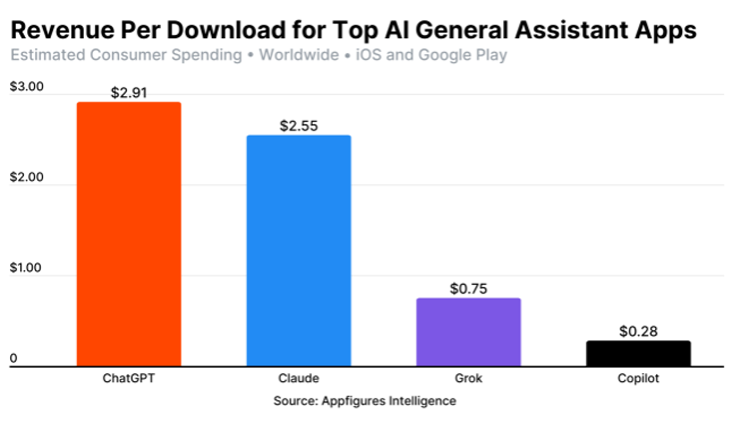 ChatGPT 모바일 앱(아이폰·안드로이드용)이 출시된 지 2년 정도밖에 안 됐는데, 벌써 전 세계 소비자 지출액이 20억 달러(약 2조 7천억 원) 를 넘겼습니다. 이 수치는 경쟁 앱들(클로드, 그록, 코파일럿)을 모두 합친 것보다 30배 이상 많다고 해요. 쉽게 말하면, AI 챗봇 시장에서 ChatGPT가 거의 ‘원톱’인 셈입니다.